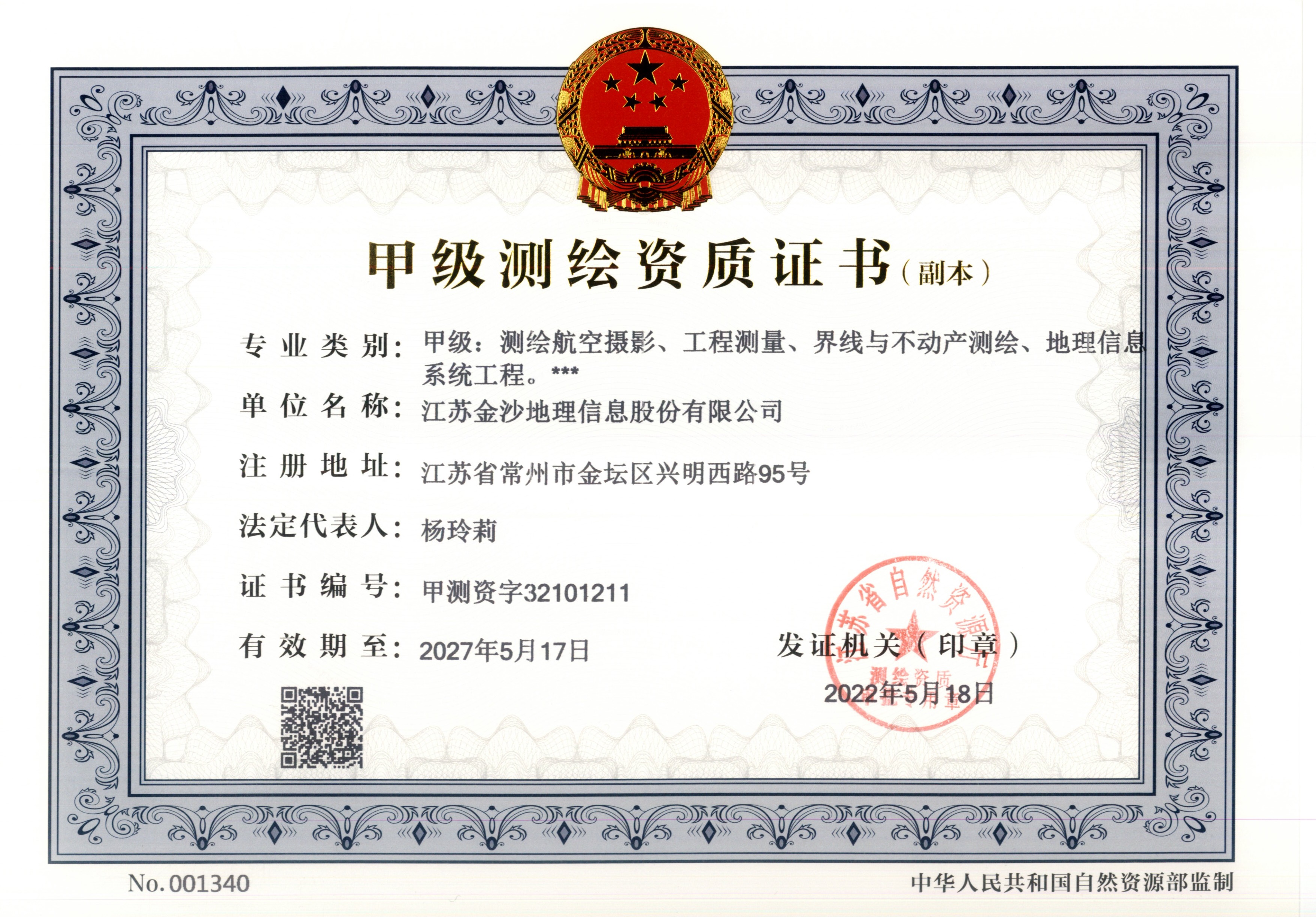 喜報(bào):江蘇金沙地理信息股份有限公司榮獲甲級(jí)測(cè)繪資質(zhì)證書(shū)